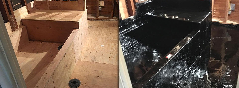 We use hot liquid asphalt combined with 3 layers of felt paper, and fiber glass in every corner and seem, so our hot mop shower pans can withstand the daily traffic. That's our job!
